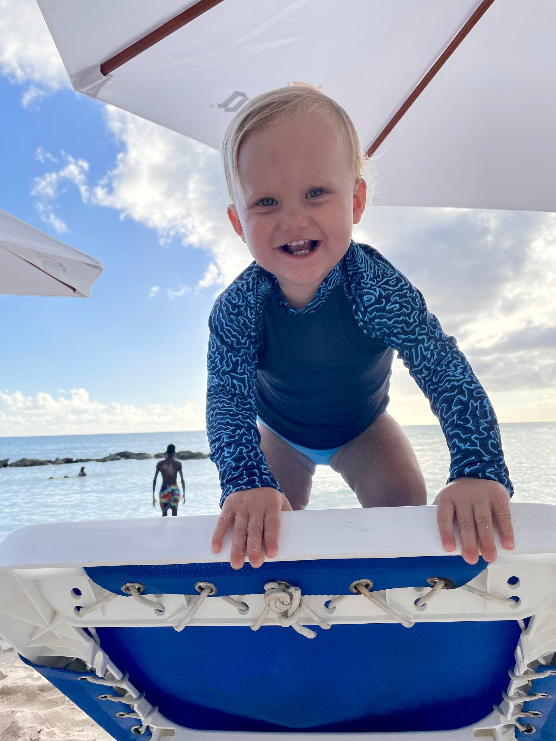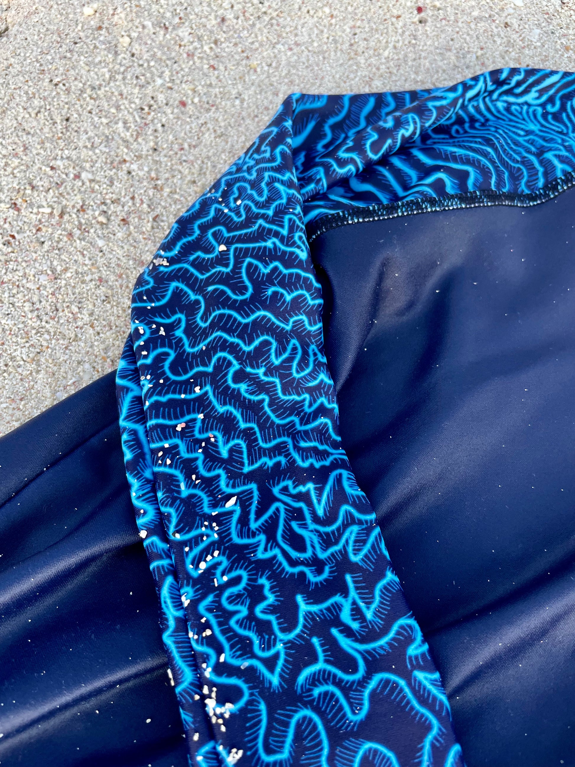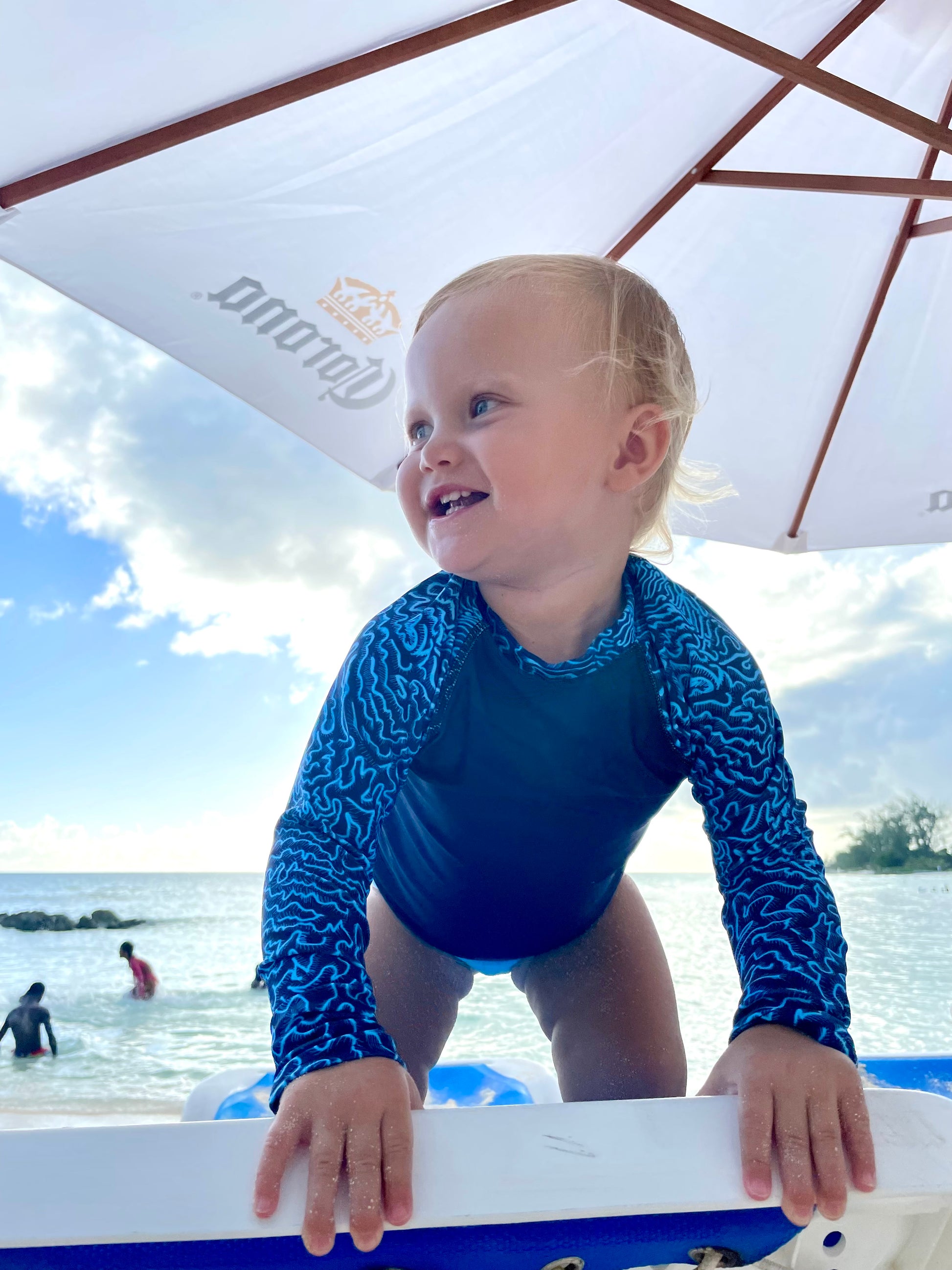 Protect the little ones from the elements with this colorful kids rash guard. Its sun-protective fabric and long body and sleeves make it perfect for running around on the beach, lake or pool side. This print was created over many many hours using images of Brain coral from Barbados and composing these into a digital painting. The specific blue colours are sampled from the ocean hues around the island of Barbados. This print suits all skin tones with its combination of rich deep blue and highlights of electric Caribbean blue!
