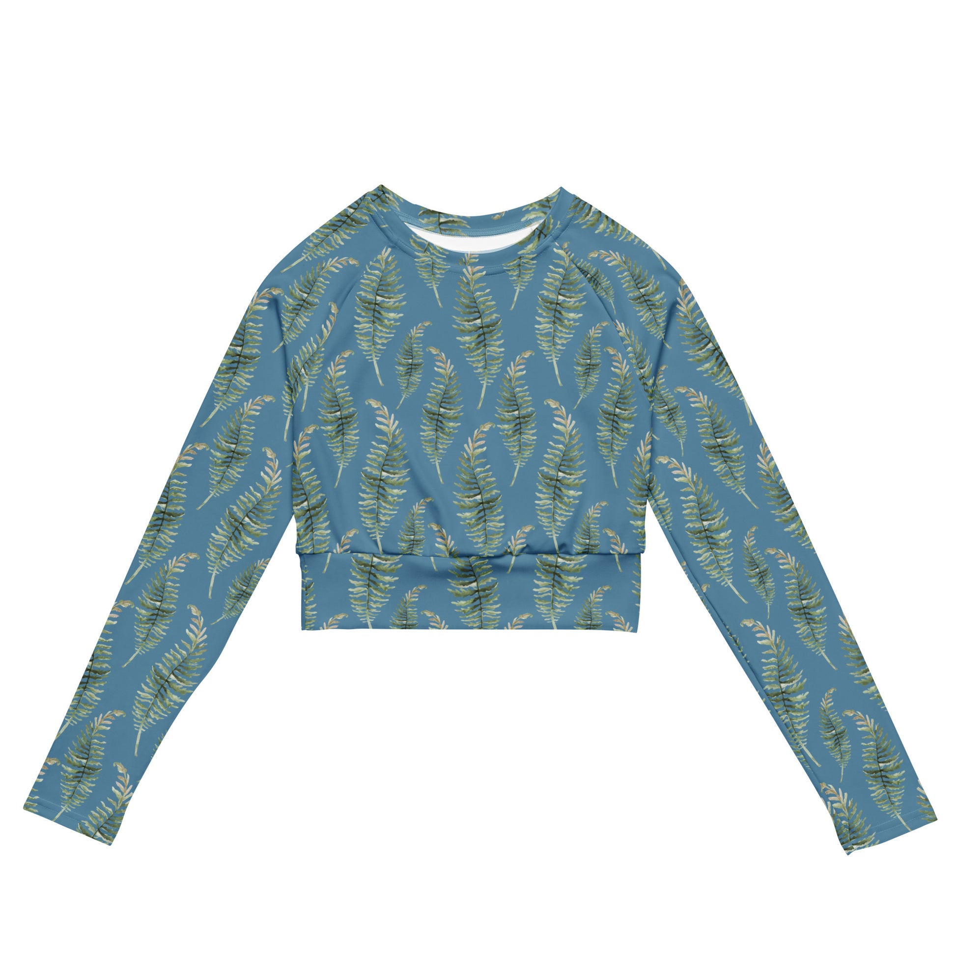 This long-sleeve crop top is made of recycled polyester and elastane, making it an eco-friendly choice for swimming, sports, or athleisure outfits. The crop top has a tear-away care label and a wide, double-layered waistline band for a comfortable fit.