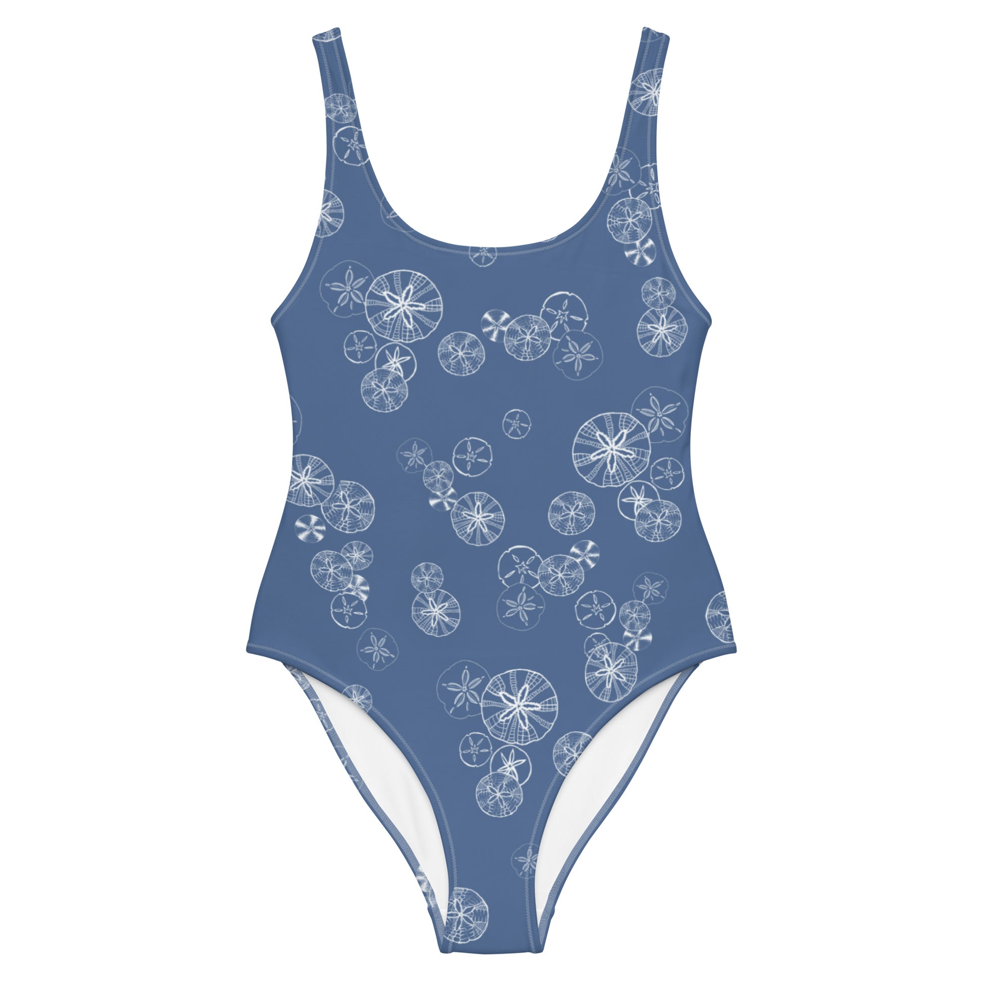 Sand Dollar print one piece swimsuit. Each sand dollar is hand drawn to create this bespoke print, each one unique just like their real life counterparts. This print on our favorite Kashmir Blue colour. This one-piece swimsuit for all figures will bring out your best features. Enjoy the smooth fabric and the flattering design, and show it off by the sea or pool!