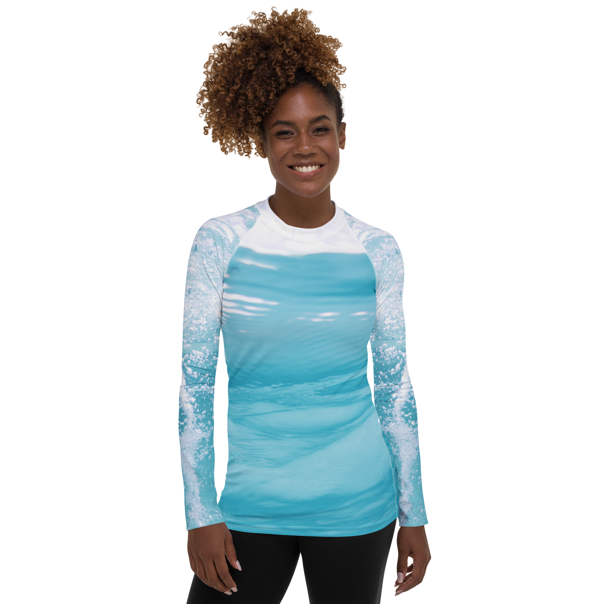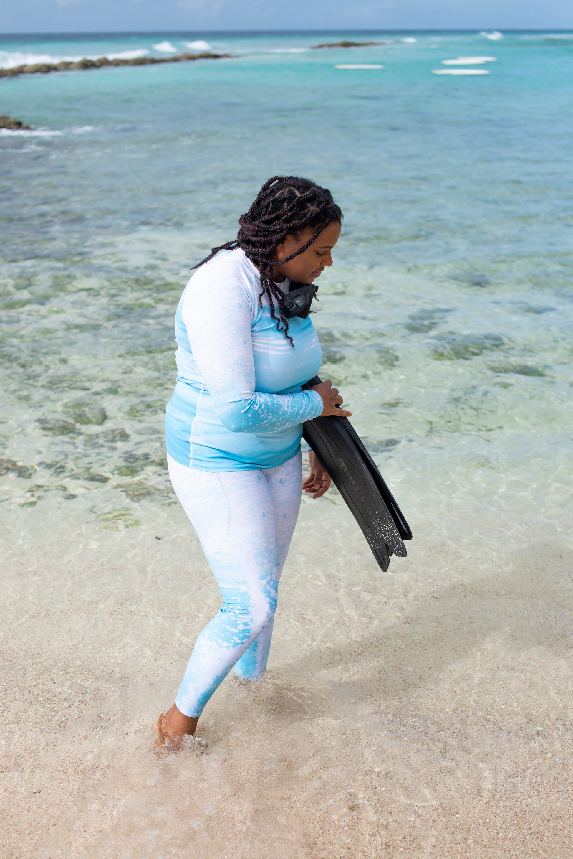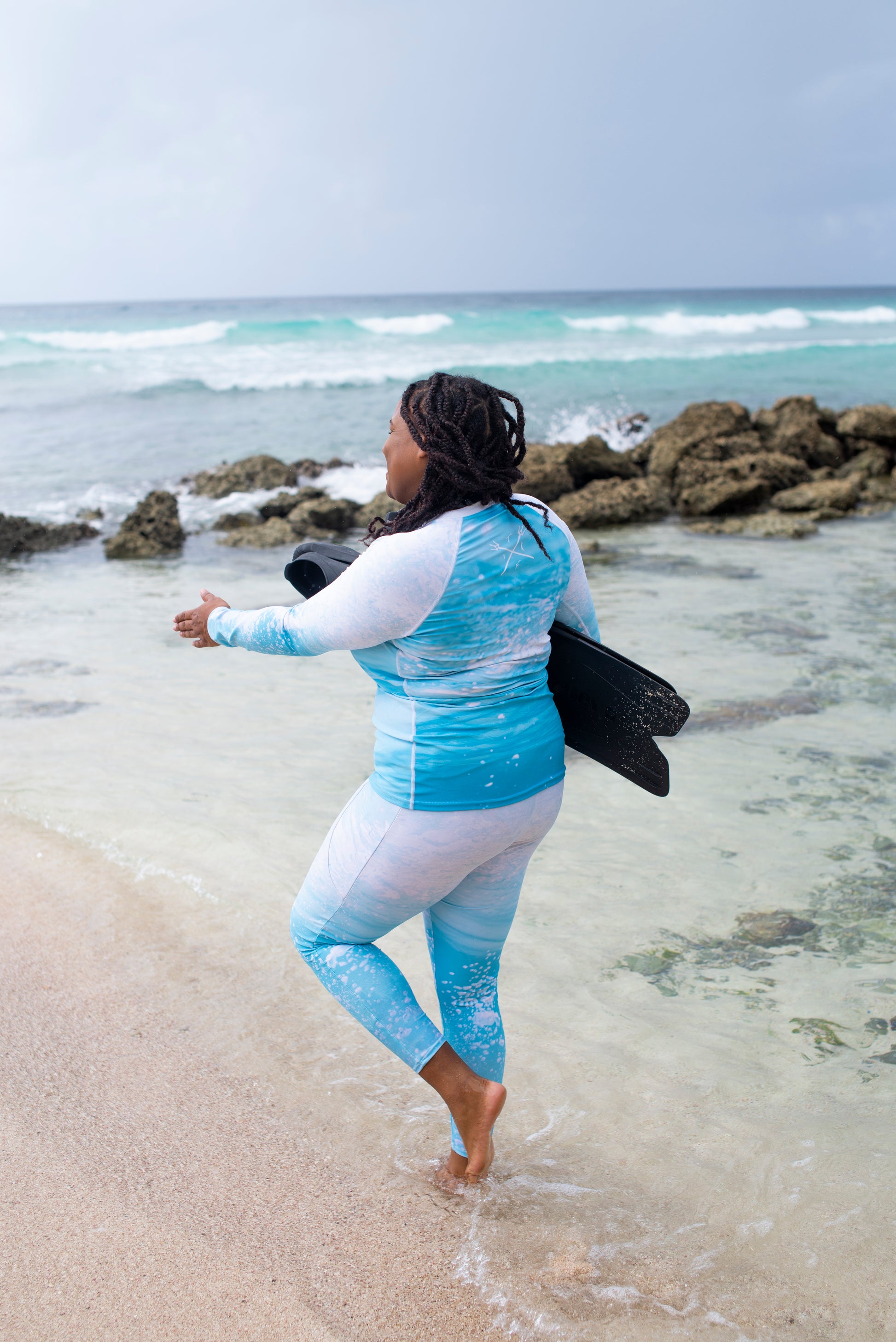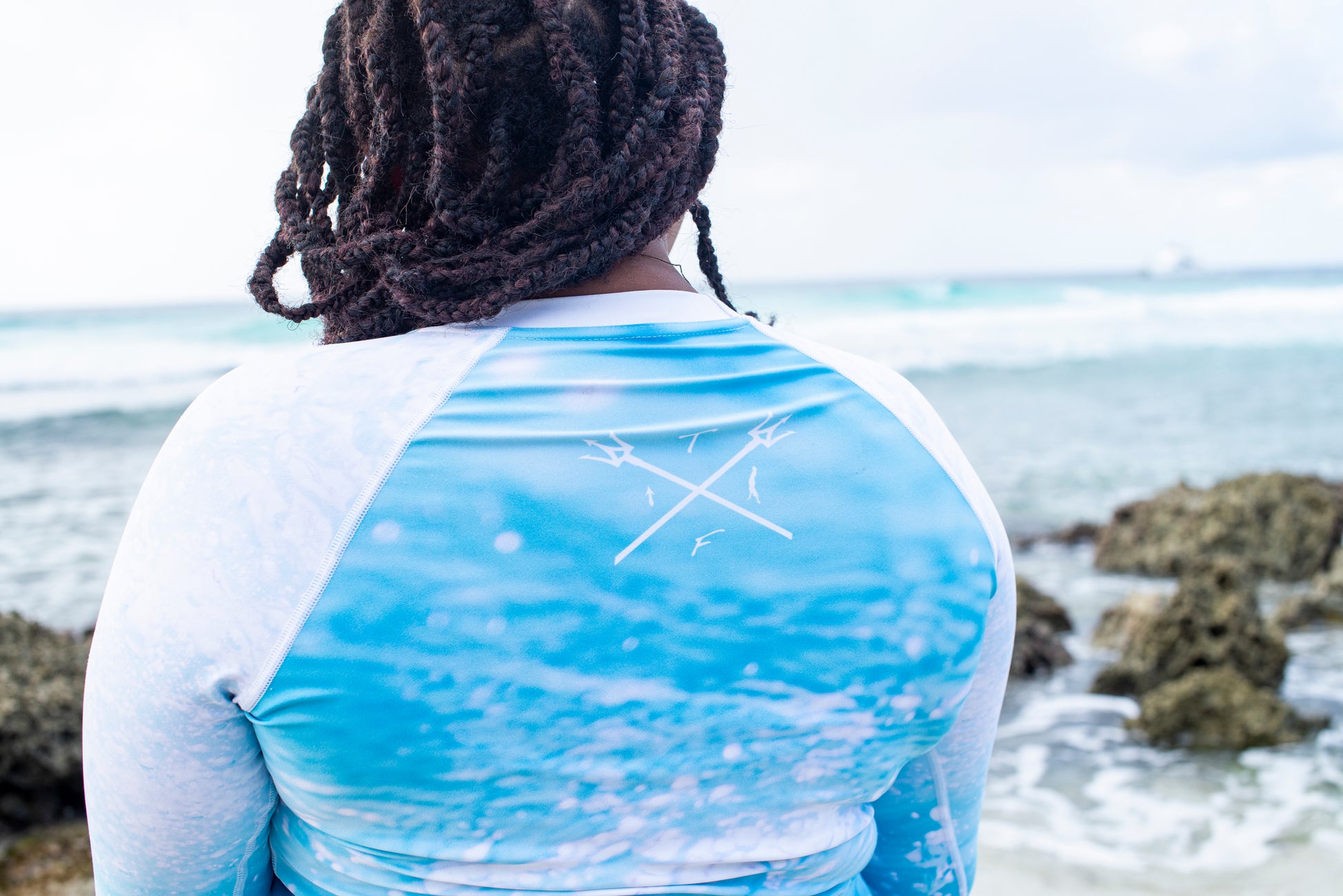This gorgeous Print is taken of the beautiful Caribbean Waters of Barbados. All the magic of the underwater world starts at the surface water line. Melt into the ocean in your stunning Recycled Bikini. This image captured by underwater photographer and Trident Freedivers Instructor Hanna Allen. It’s too easy to fall in love with this bikini set with its beautiful fit, recycled material and gorgeous print. Be your most active self in this smooth and versatile long-sleeve rash guard! It protects you from the sun, wind, and other elements while doing sports, and the slim fit, flat ergonomic seams, and the longer body gives extra comfort.